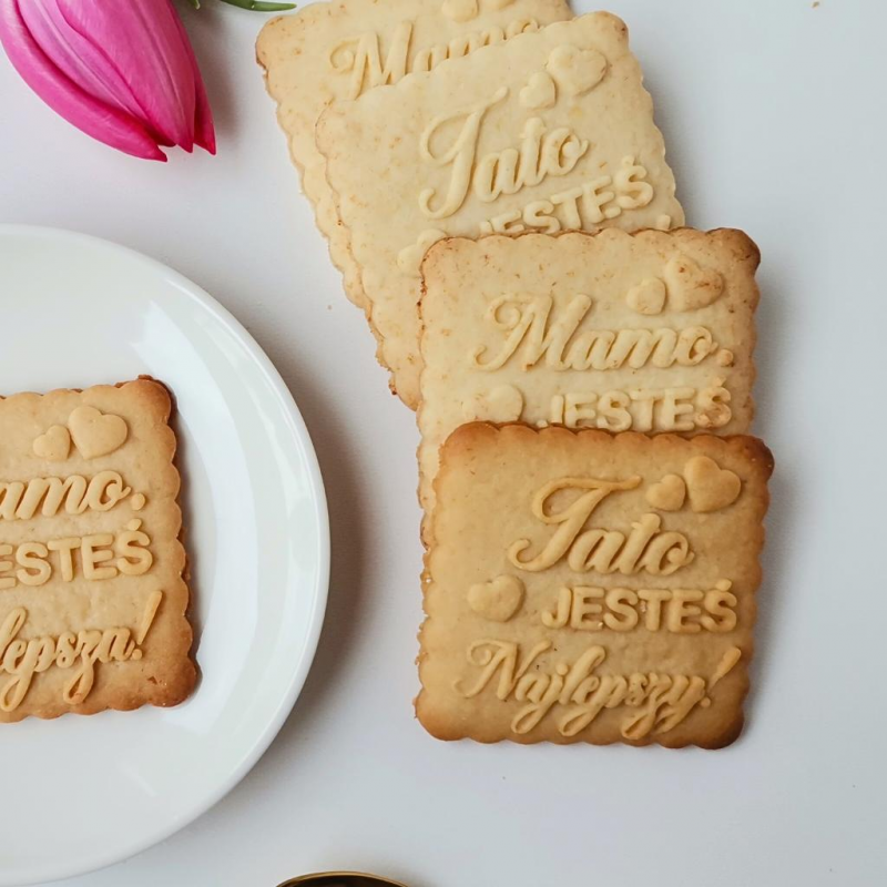 • * Grafiki oraz napisy wykonane metodą grawerowania tworzą na ciastkach dobrze widoczne, wypukłe wzory.
